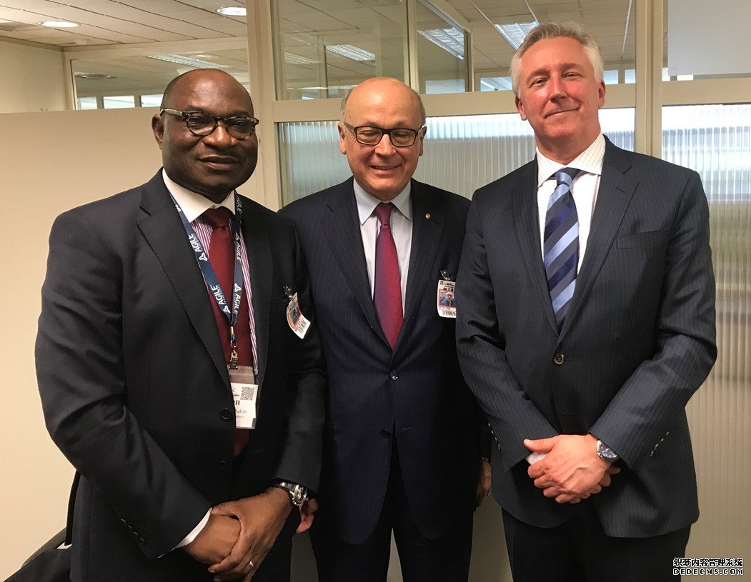 FIDIC秘書(shū)長(zhǎng)Nelson Ogunshakin OBE、FIDIC主席Alain Bentejac和世界銀行首席采購(gòu)官Enzo De Laurentiis在簽字儀式后合影