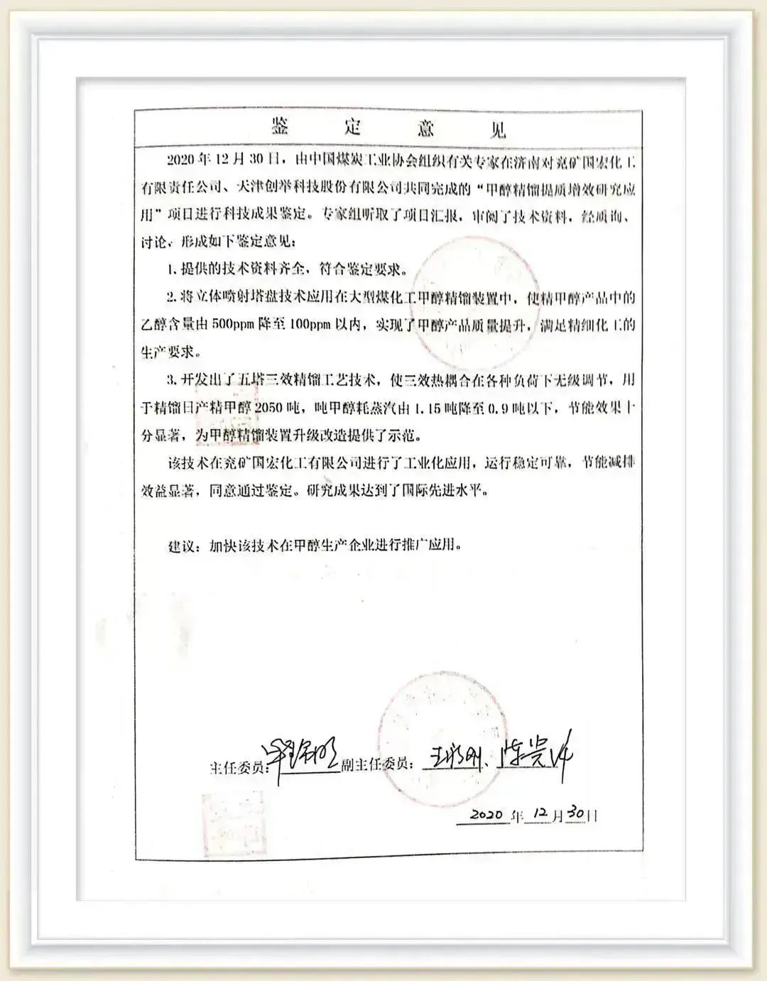 2020年,由兗礦國宏公司及創(chuàng)舉科技共同申報的“甲醇精餾提質(zhì)增效研究應(yīng)用”順利通過中國煤炭工業(yè)協(xié)會科學(xué)技術(shù)成果鑒定,并鑒定該項技術(shù)成果達(dá)到“國際先進(jìn)”水平。
