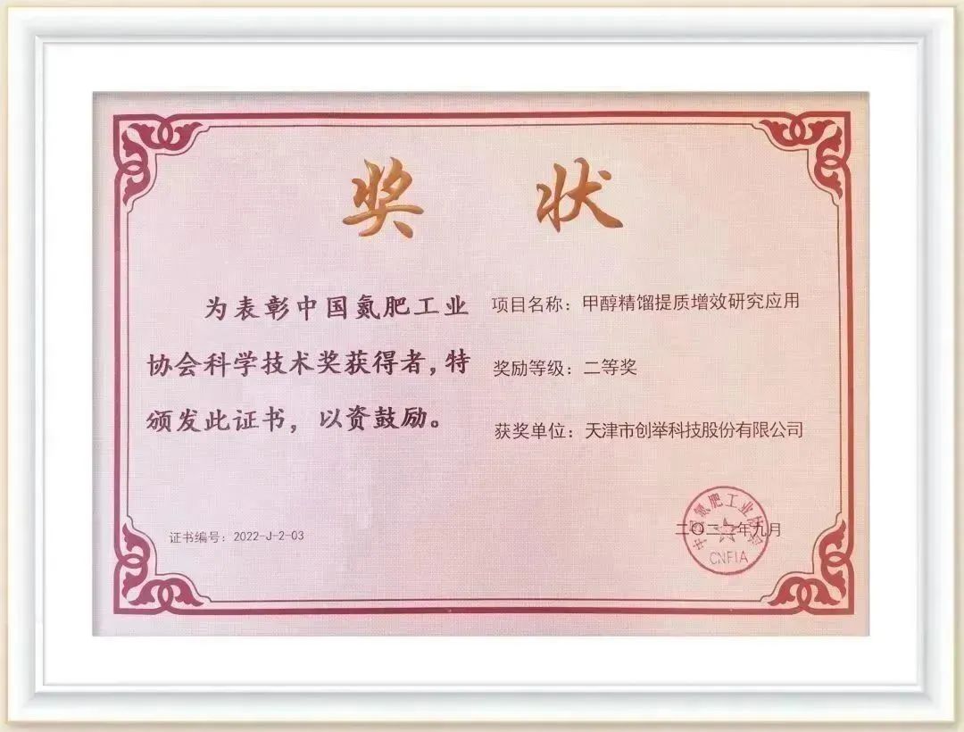 2022年,創(chuàng)舉科技申報的“甲醇精餾提質(zhì)增效研究應(yīng)用”項目,榮獲中國氮肥工業(yè)協(xié)會科學(xué)技術(shù)獎二等獎。