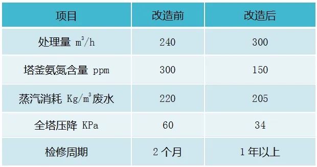 2019年更換為我公司CJVP塔板后,裝置運行穩定,檢修周期延長,處理量擴大25%,蒸汽消耗節省5%以上,改造前后數據對比如下: