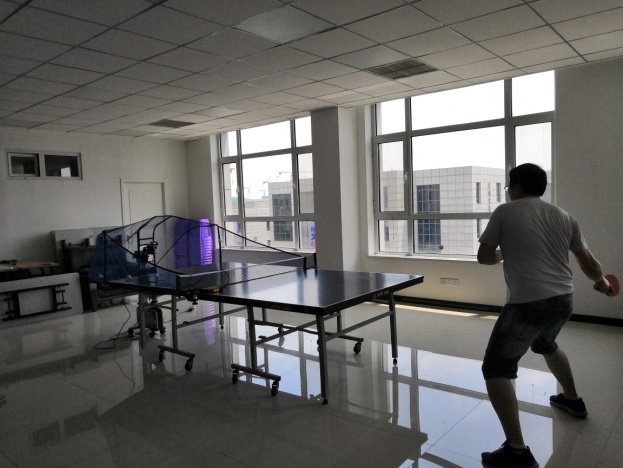 你看,乒乓球臺前,新手正對著發球機練習標準動作,期待他能早日步入高手行列。